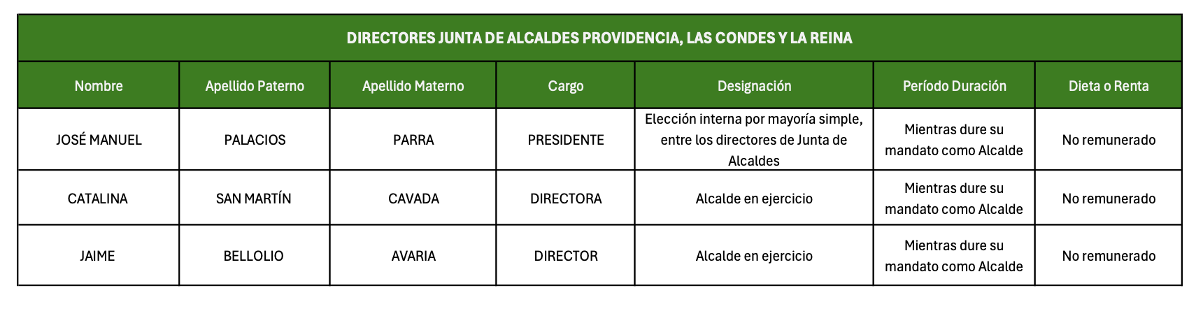 Las autoridades de la Junta de Alcaldes no son designados por elección popular. Los directores de la Junta de Alcaldes, serán los alcaldes en ejercicio de las municipalidades que la componen. El Presidente de la Junta será el alcalde que ella misma designe mediante votación simple de entre sus miembros. Actuará de Secretario el Secretario Municipal que ella misma también determine. En el caso de que el Alcalde o el Secretario Municipal cesen en sus cargos, la Junta procederá a una nueva elección.![]() |